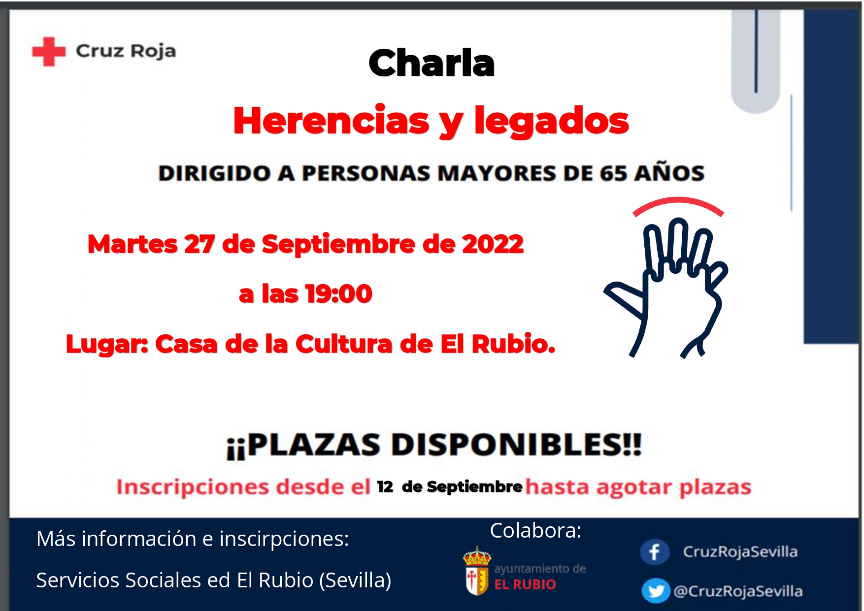 Ya puedes inscribirte para asistir a la charla HERENCIAS Y LEGADOS que organiza Cruz Roja el martes 27 de septiembre a las 19:00h. en el Salón de Actos de la Casa de la Juventud y Cultura.