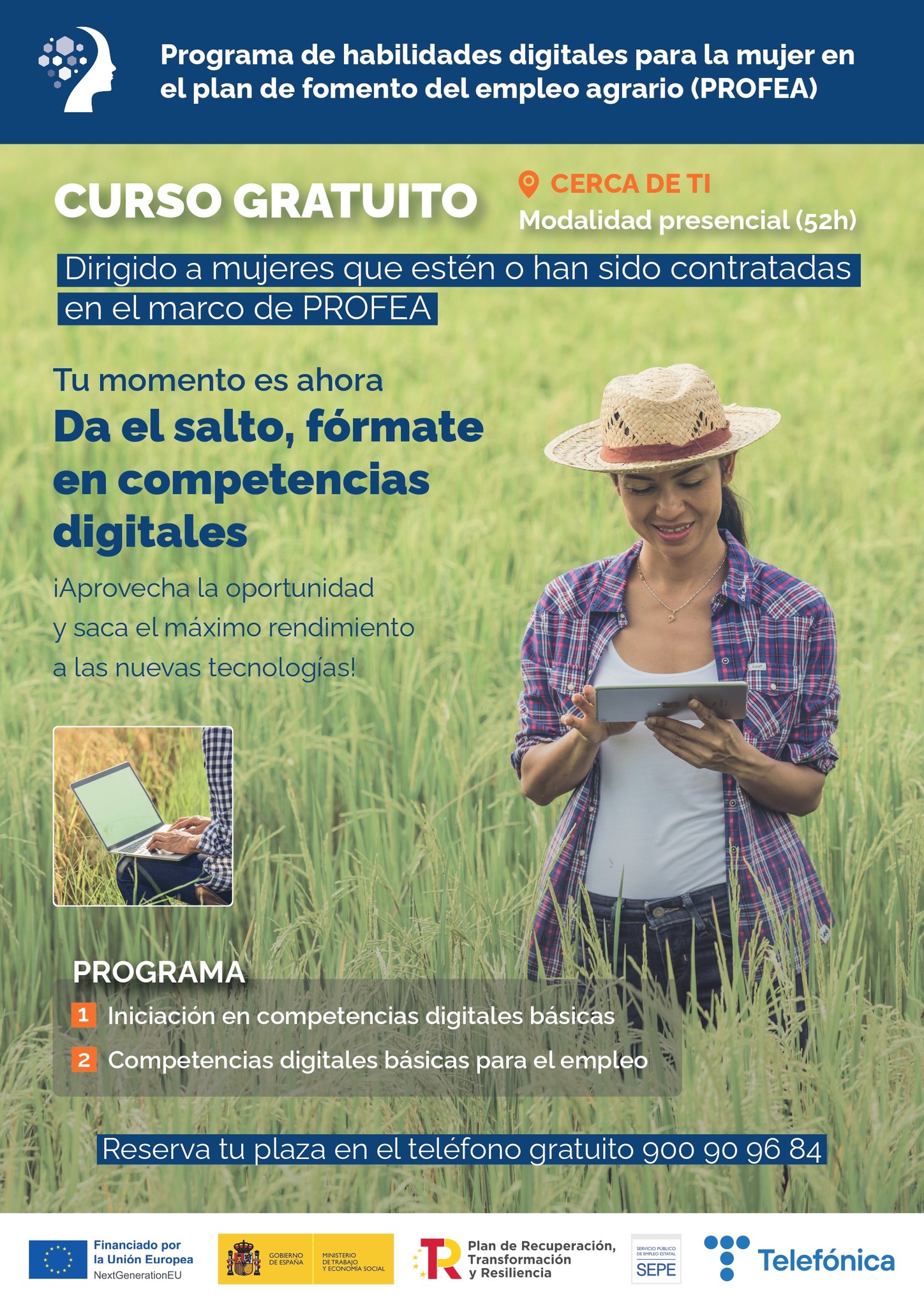 Promovido por el Servicio Público de Empleo Estatal a través del Plan de Recuperación, Transformación y Resiliencia del Fondo de Recuperación Next Generation EU. El objetivo es reducir la brecha digital y de género en las zonas rurales facilitando la adquisición de competencias digitales a mujeres que cotizan y perciben el subsidio agrario.