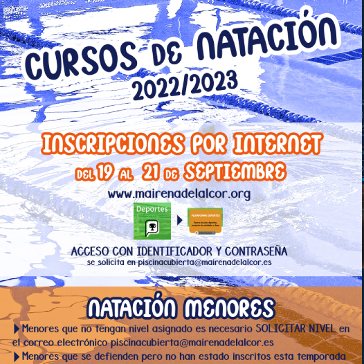 Los menores que no tengan nivel asignado, deben solicitar nivel escribiendo un correo a la dirección piscinacubierta@mairenadelalcor.es. Los menores que se defiendan en el medio acuático pero no han estado inscritos esta temporada en los cursos de natación, deben hacer la prueba de nivel en la piscina de verano del 1 al 16 de septiembre en horario de 17 a 20 horas.
