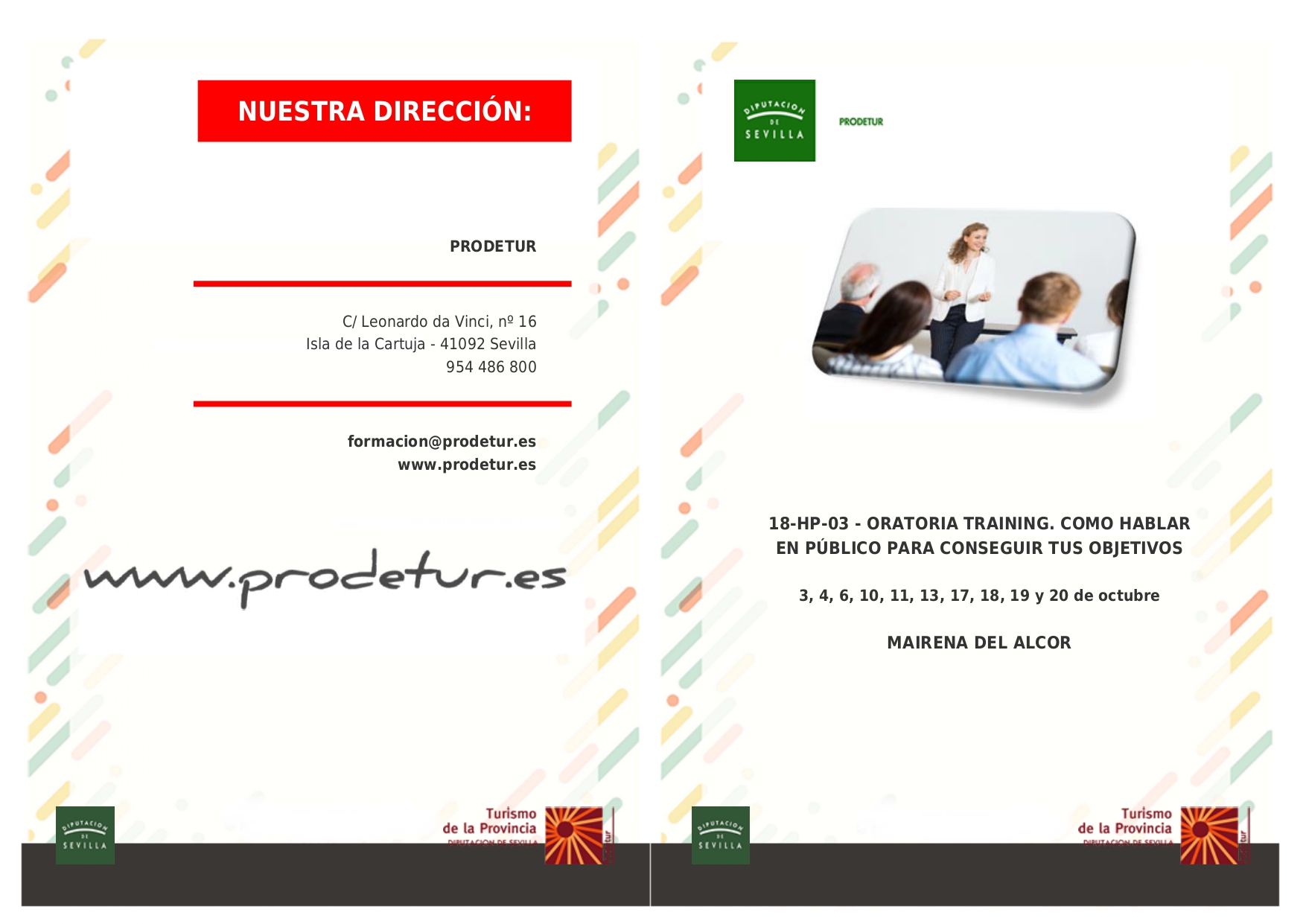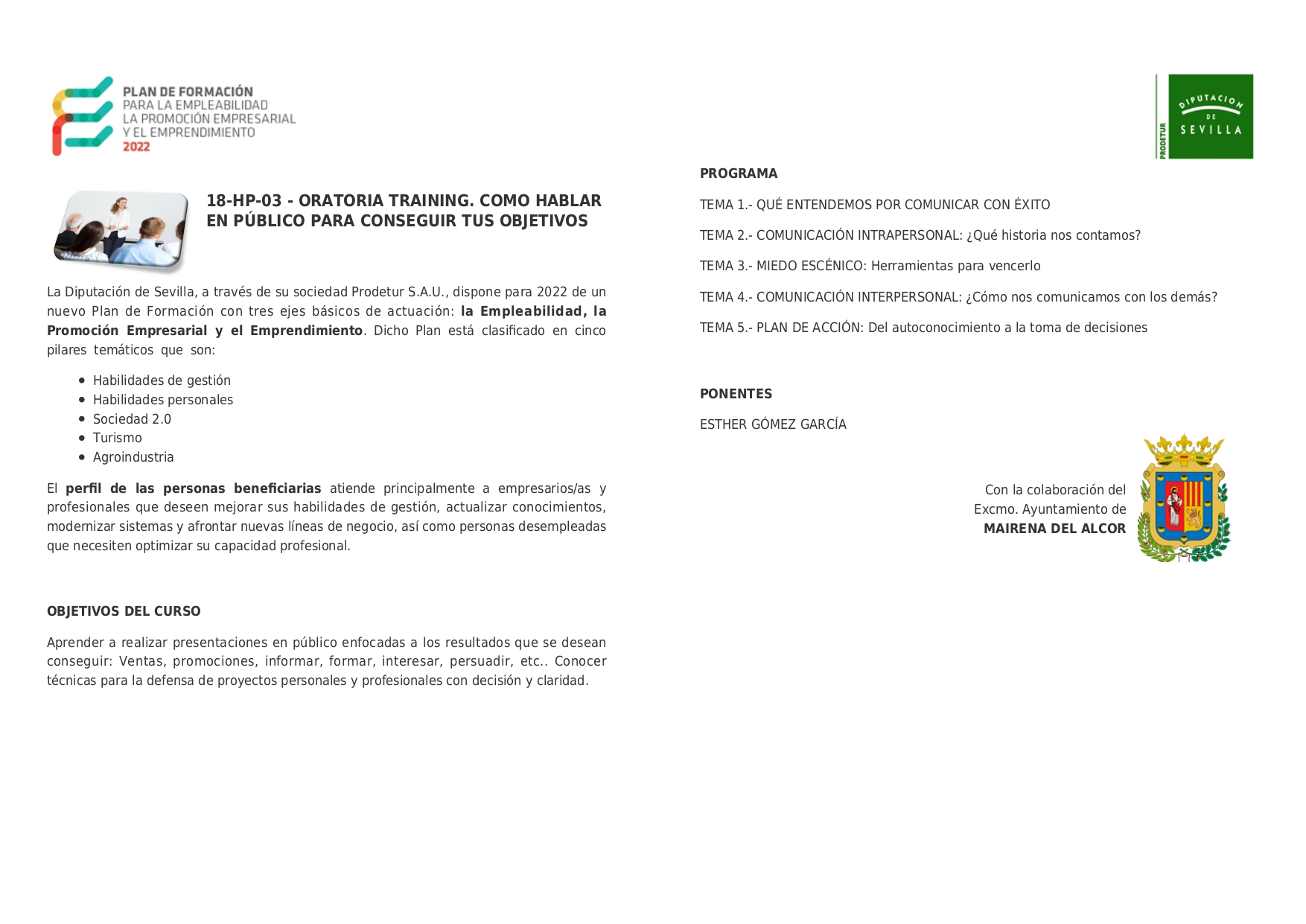 La Delegación de Formación difunde el curso 'Oratoria traning. Cómo hablar en público para conseguir tus objetivos' que impartirá en la modalidad presencial Prodetur con la colaboración del Ayuntamiento de Mairena del Alcor, del 3 al 20 de octubre de 16.30 a 20.45 horas en la Villa del Conocimiento y las Artes.