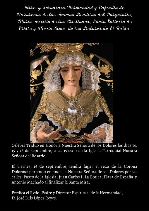 La Ilustre y Fervorosa Hermandad y Cofradía de Nazarenos y de la Ánimas Benditas del Purgatorio, María Auxiliadora de los Cristianos, Santo Entierro de Cristo y María Stma. de los Dolores de El Rubio, celebra una serie de actos por la festividad de Nuestra Señora de los Dolores.