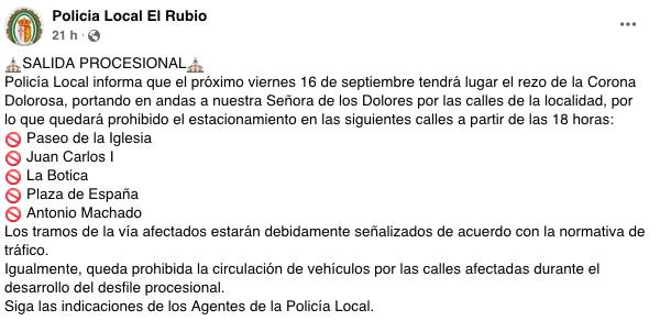 Policía Local informa que el próximo viernes 16 de septiembre tendrá lugar el rezo de la Corona Dolorosa, portando en andas a nuestra Señora de los Dolores por las calles de la localidad, por lo que quedará prohibido el estacionamiento en las siguientes calles a partir de las 18 horas: