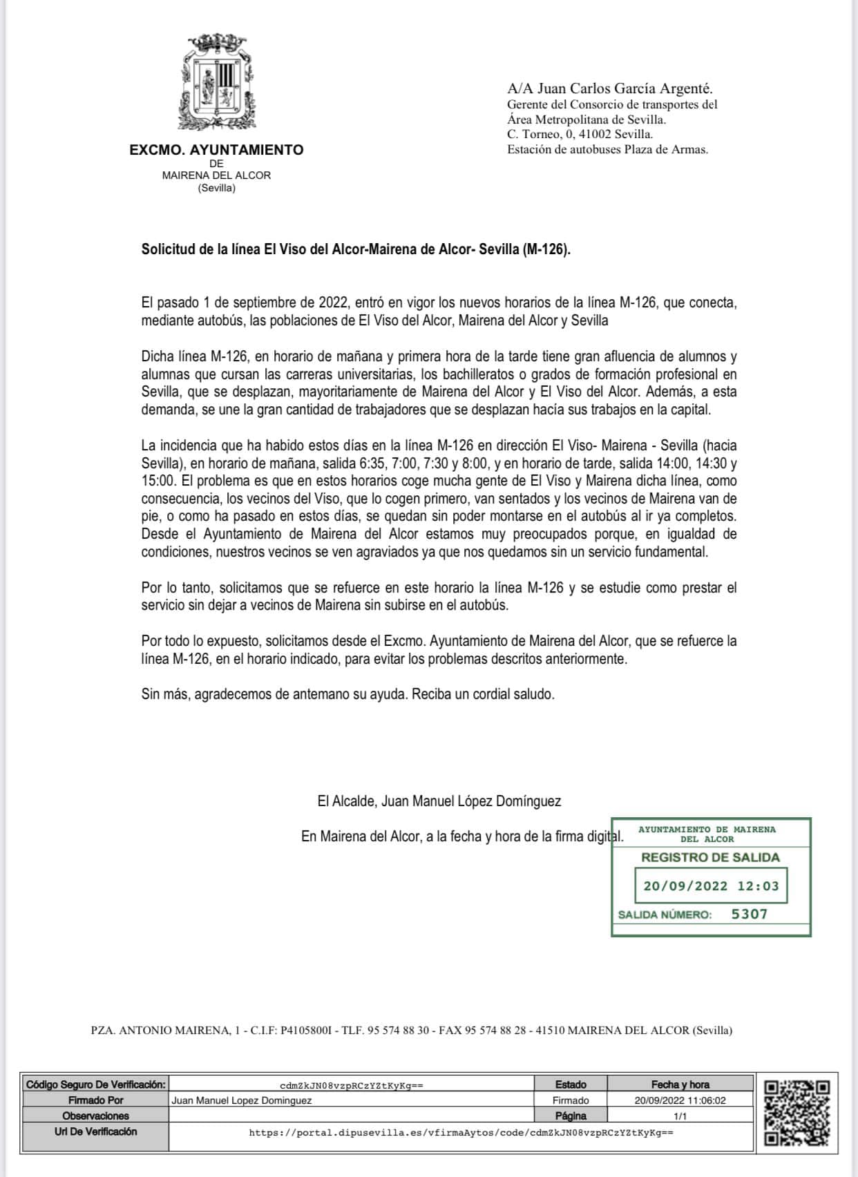 Además, en dicha reunión se tratará el refuerzo de la línea M-126, ya que en horario de mañana y primera hora de la tarde tiene gran afluencia de alumnos y alumnas que cursan las carreras universitarias, los bachilleratos o grados de formación profesional en Sevilla, que se desplazan, mayoritariamente de Mairena del Alcor y El Viso del Alcor.