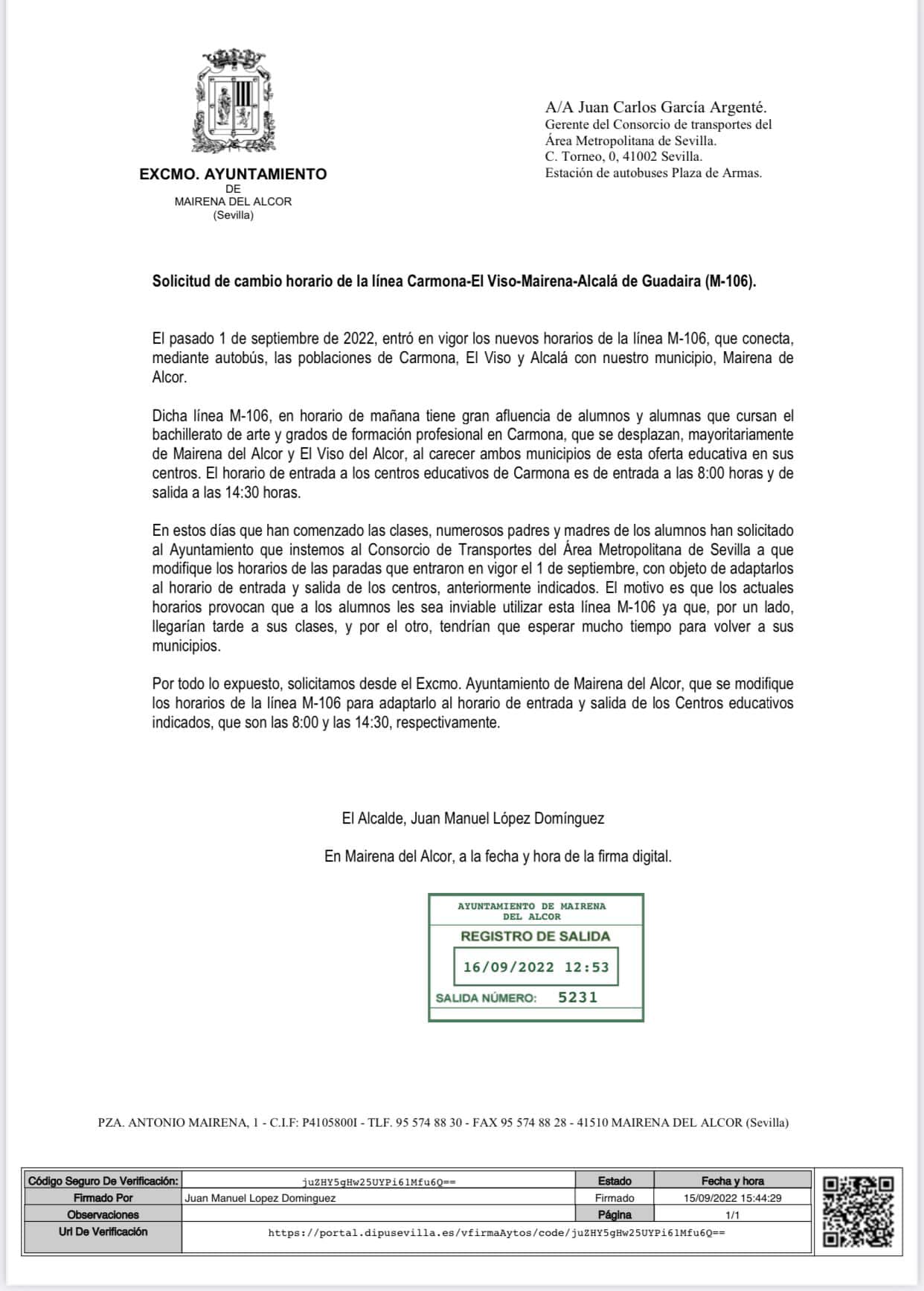 El alcalde de Mairena del Alcor, Juanma López, junto al delegado de Urbanismo, Pepe Navarro, solicitaron el pasado 16 de septiembre una reunión con el Consorcio de Transportes del Área Metropolitana de Sevilla en la que expondrán el cambio de horario de la línea Carmona-El Viso-Mairena-Alcalá de Guadaira (M-106) y el refuerzo de la línea El Viso del Alcor-Mairena del Alcor-Sevilla (M-126).