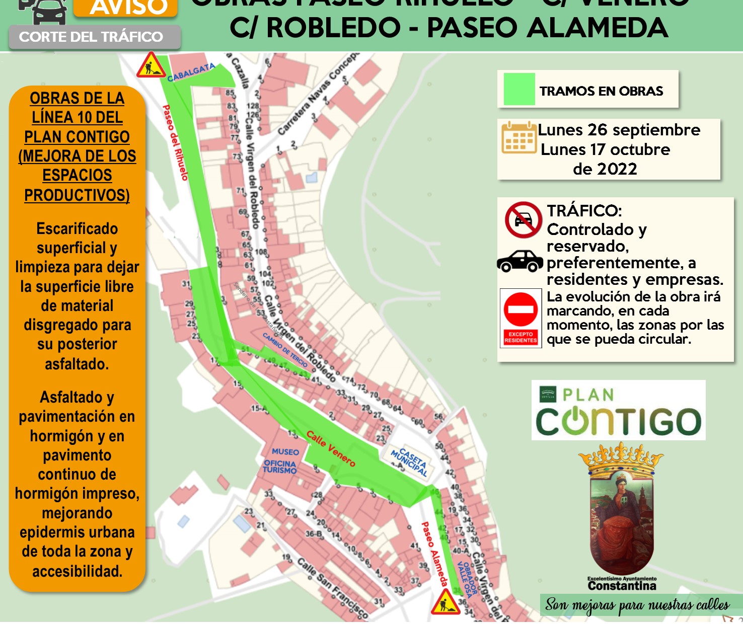 Enmarcadas en la Línea 10 del Plan Contigo de la Diputación de Sevilla de Mejora de los Espacios Productivos, desde el lunes 26 de septiembre hasta el lunes 17 de octubre se va a proceder al escarificado (disgregación de la superficie del terreno y su posterior compactación a efectos de homogeneizar la superficie de apoyo) para su posterior asfaltado y pavimentación en hormigón y en pavimento continuo de hormigón impreso, mejorando epidermis urbana de toda la zona y accesibilidad de las zonas: Paseo del Rihuelo (desde la nave de la Cabalgata de Reyes) hasta Calle Venero (altura de la Caseta Municipla), el tramo de Calle Virgen del Robledo que va de Calle Venero hasta el Restaurante Cambio de Tercio y lateral del Paseo de la Alameda (números pares) hasta la altura aproximada del Obrador Valle de la Osa.