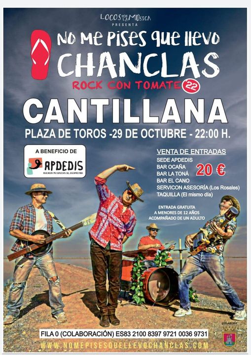 El grupo No me pises que llevo chanclas actuará el 29 de octubre, en la plaza de toros de Cantillana, a beneficio de APDEDIS, Asociación Pro Derechos del Discapacitado de Cantillana.