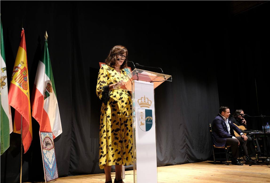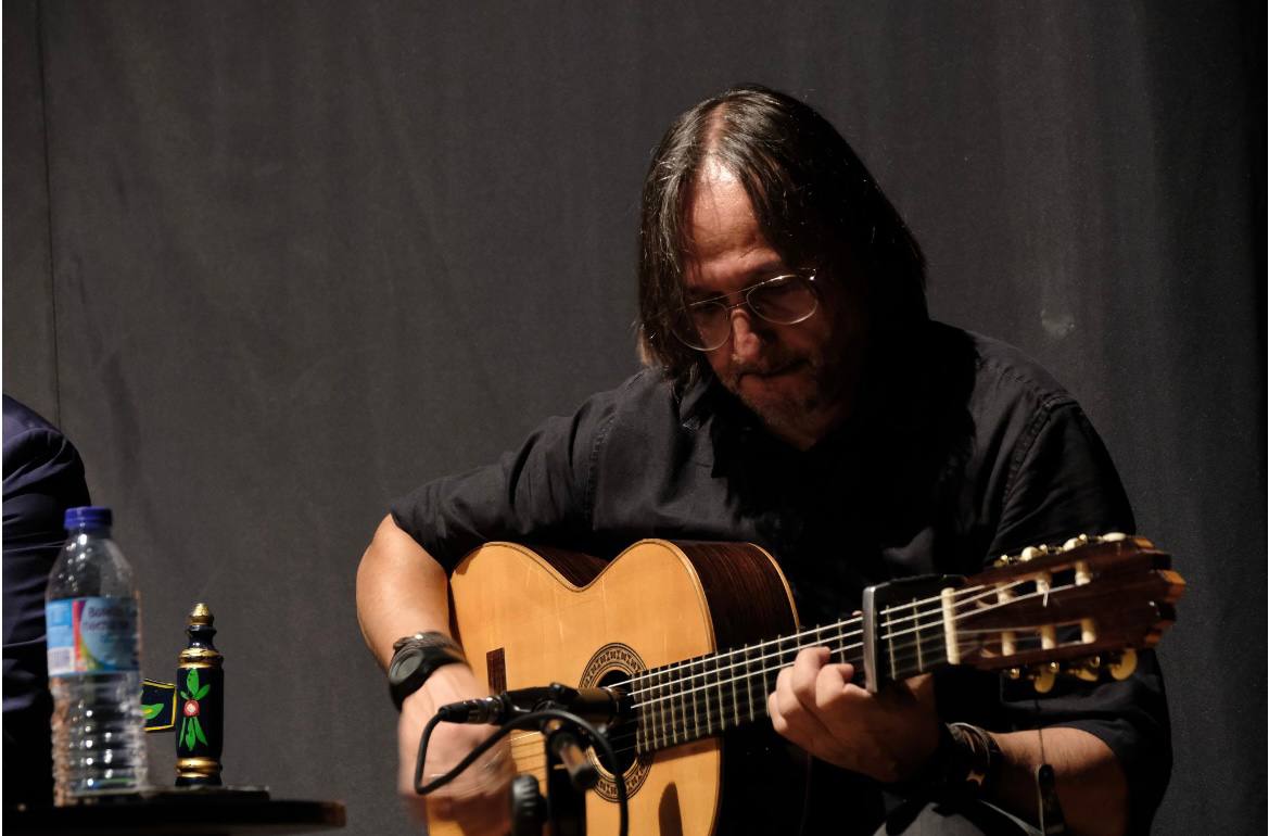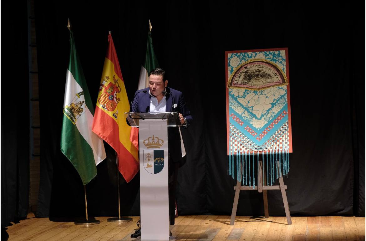 Tras la presentación que sobre Alejandro hizo la la el Ayuntamiento de Santiponce, la música se tomo la escena en la voz del propio pregonero, Aljandro Martínez Rodríguez, que recibió a su publico sentado en la silla de enea para entonarse con la guitarra de Juan Martín Rosado, las primeras sevillanas con la que deleitó a los asistentes.