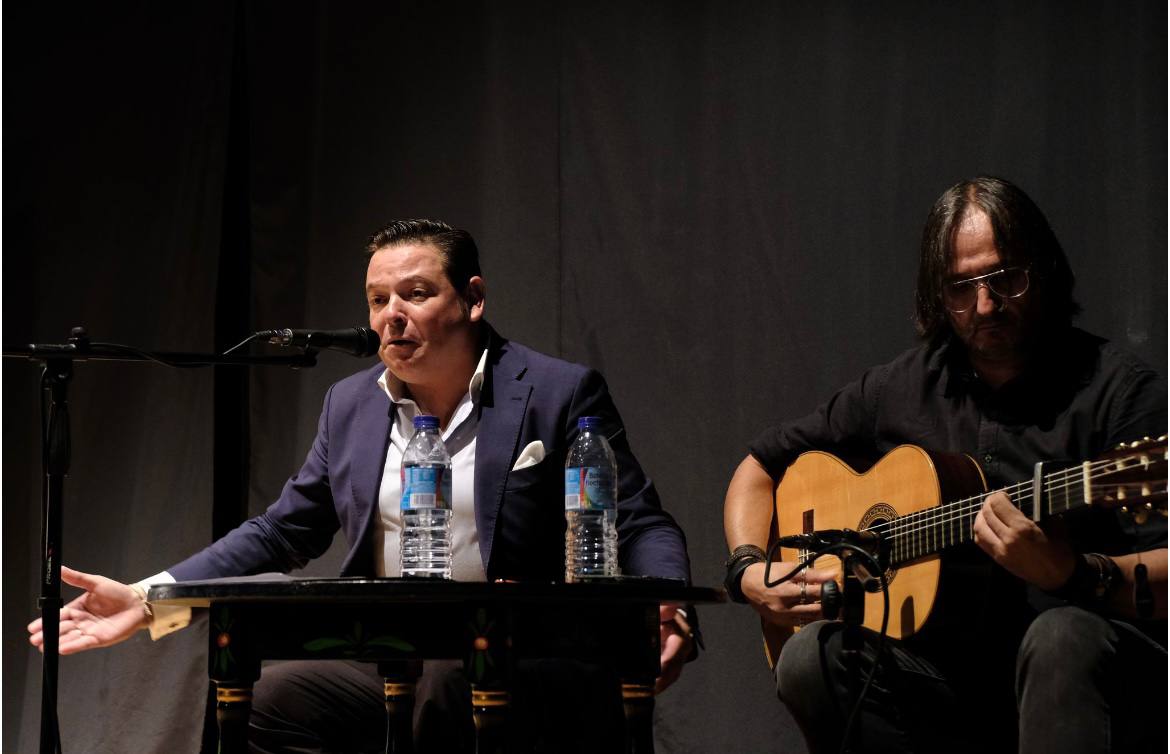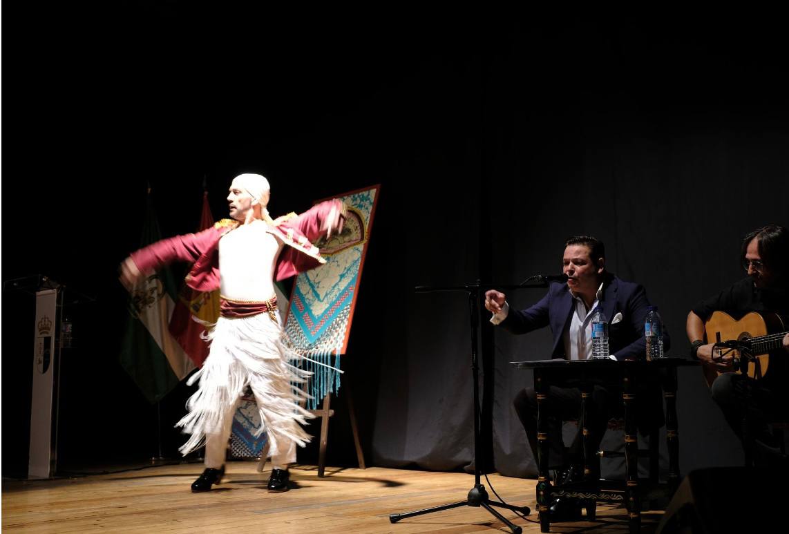 Si la magia del momento que sumaban la portentosa voz de Alejandrpo y el sublime rasgueo de la gitarra de Juan no era poca, un bailaor rompe en escena con pasos sordos que hizo sentir al respetable que bailaba en el aire, pasos de fuerza y decisión que marcaban el flamenco sentío que marca siempre en sus actuaciones José Luis Gallego. Tras esta entrada sonora, Martínez se dirigió al atril para recordar las ferias de antes, las de albero y vaso de vino de barro, incluso las de cuando era chico, esas ferias del pradillo y plaza de toros con albero, en la que la sus padres pasaban el día a día en el real, ayudando a su Hermandad del Rocío, trabajando como siempre han trabajado en esta Hermandad y como una gran familia.