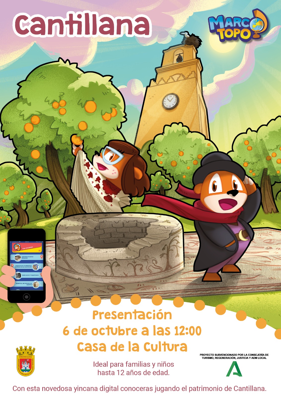El próximo 6 de octubre, a las 12:00, en la Casa de Cultura de Cantillana tendrá lugar la presentación de la APP 'Marco Topo', una aplicación web dirigida al público infantil hasta los 12 años para dar a conocer el patrimonio cultural y natural de Cantillana ayudándose de una animación, el topo Marco.