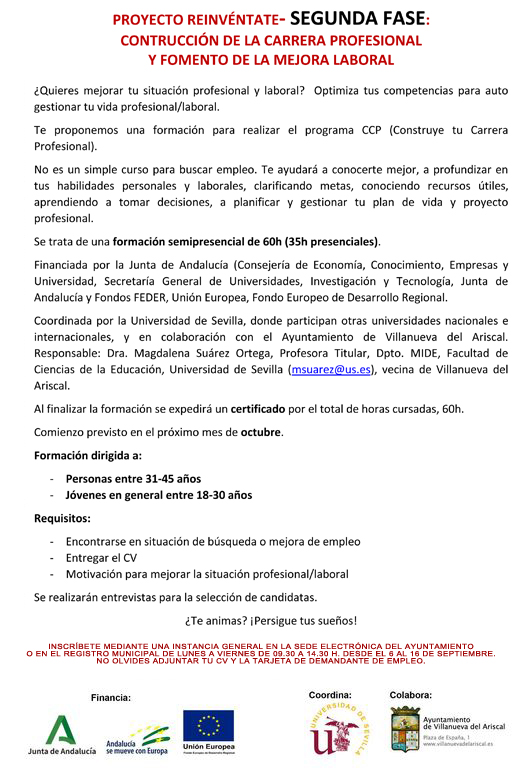 Se trata de una formación que te ayudará a conocerte mejor, a profundizar en tus habilidades personales y laborales, clarificando metas, conociendo recursos útiles, aprendiendo a tomar decisiones, a planificar y gestionar tu proyecto profesional.