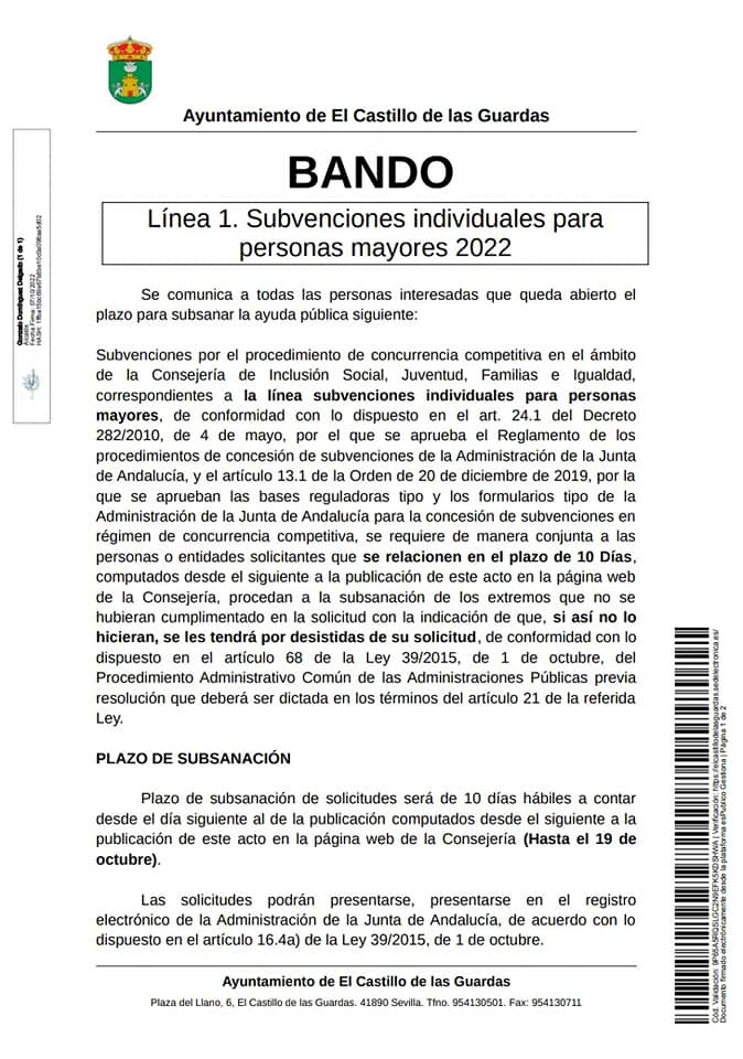 Por el presente BANDO se informa a la ciudadanía de la apertura del plazo para subsanar cualquier punto de la subvención individual para personas mayores 2022.