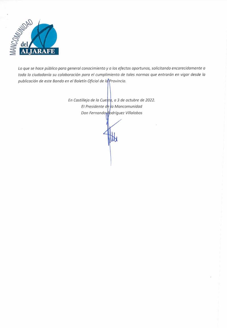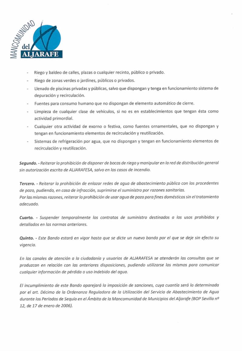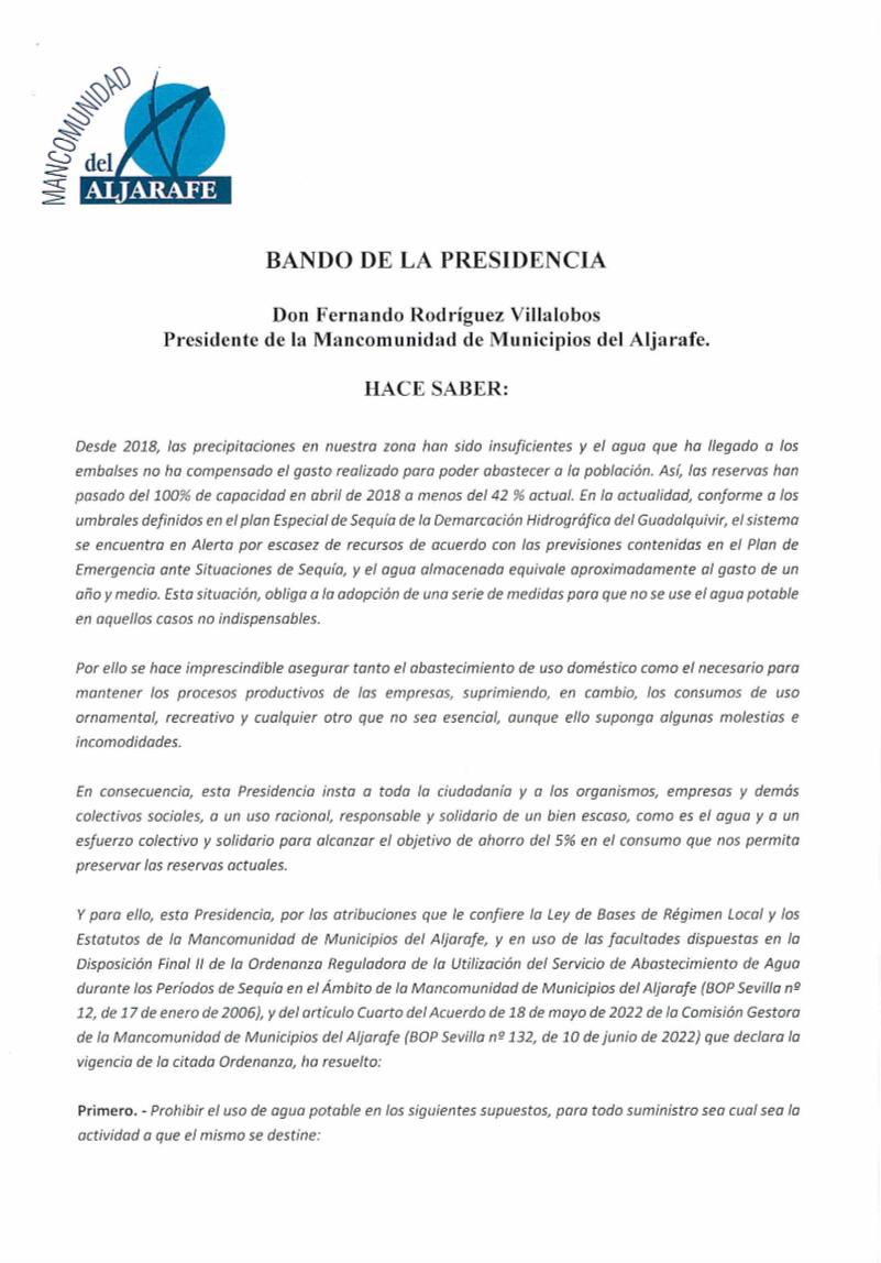 Ante el estado de las reservas de agua actual debido a la sequía que se viene sufriendo desde 2018, la Presidencia de la Mancomunidad de Municipios del Aljarafe en aplicación de sus atribuciones ha prohibido determinados usos del agua potable sea cual sea la actividad a la que se destine.