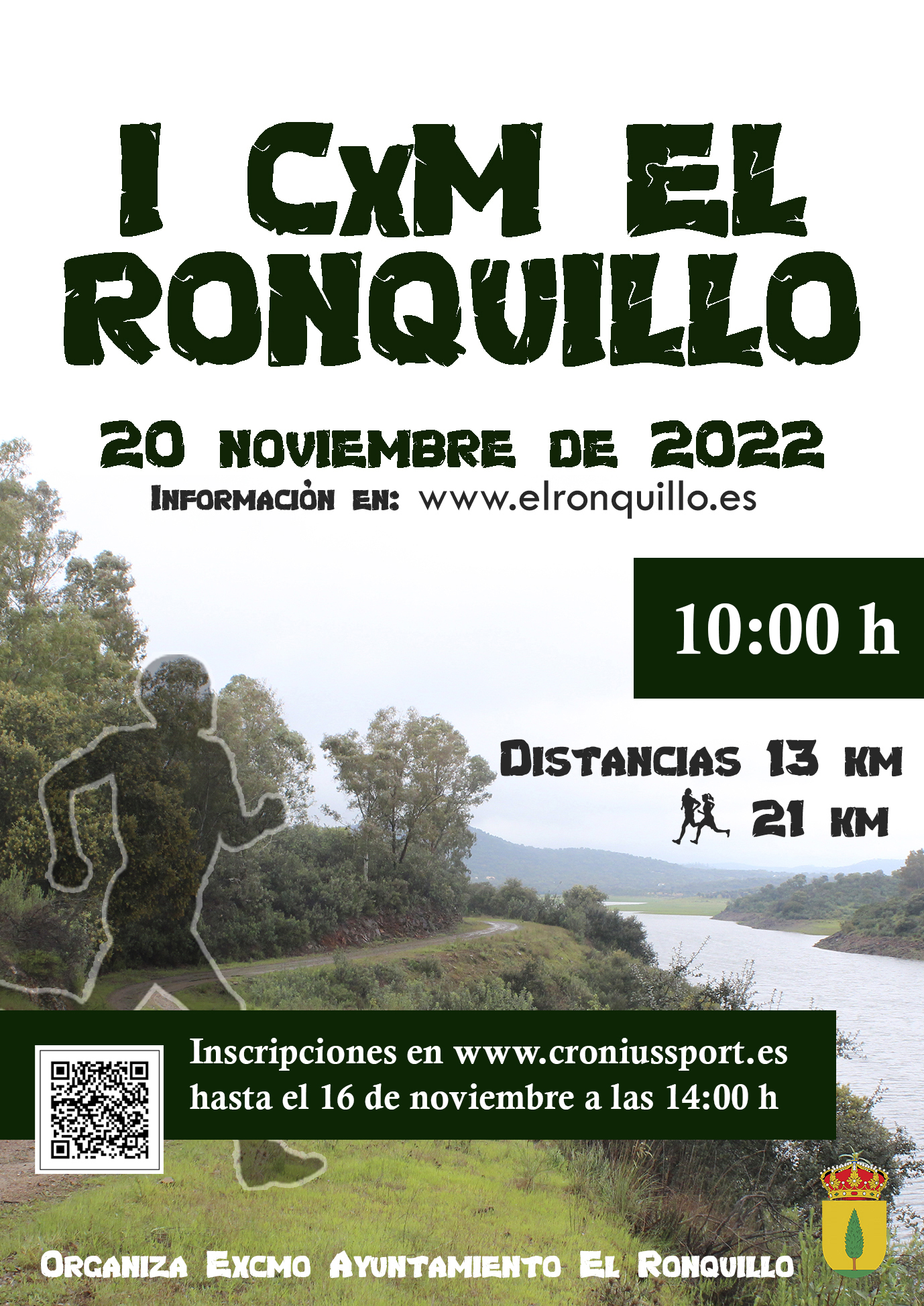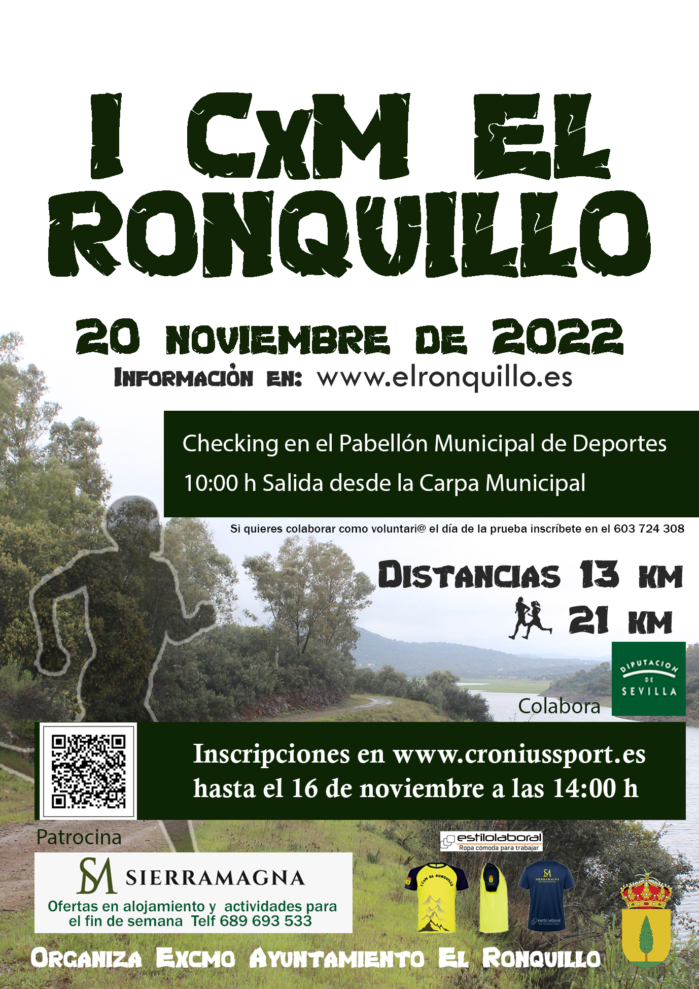 La Delegación de Deportes del Excelentísimo Ayuntamiento de El Ronquillo presenta la primera edición del CxM El Ronquillo organizada por el Excmo. Ayuntamiento de El Ronquillo, con el patrocinio de SierraMagna. Colabora la Diputación de Sevilla y Estilo laboral.