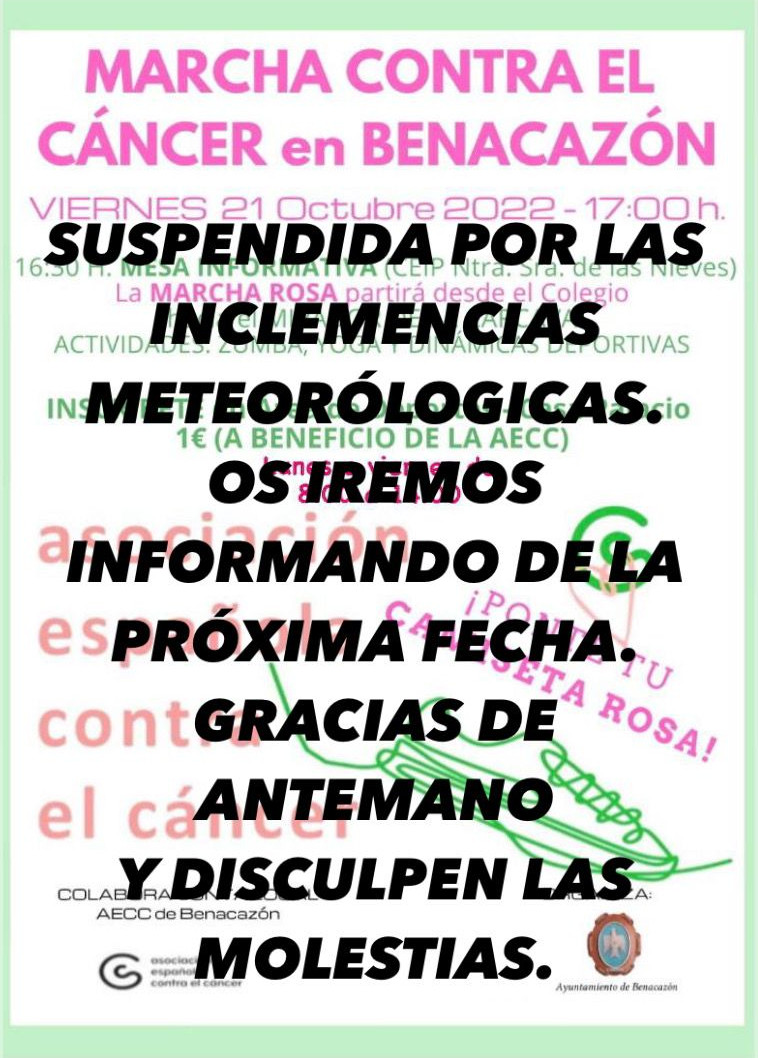 Desde el Ayuntamiento de Benacazón, a través de la Delegación de Deportes y la Junta Local de la AECC, informamos que, debido a las inclemencias meteorológicas, ha quedado suspendida la MARCHA ROSA al Mirador del Guadiamar que, con motivo del Día Mundial Contra el Cáncer de Mama, iba a celebrarse esta tarde.