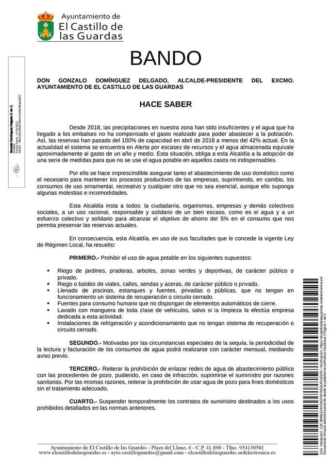 BANDO de alcaldía en relación a la situación crítica en el abastecimiento de agua potable, ante la falta de precipitaciones en el tiempo, desde el Ayuntamiento se han tomado una serie de medidas y prohibiciones para que entre toda la ciudadanía colaboremos en el ahorro.