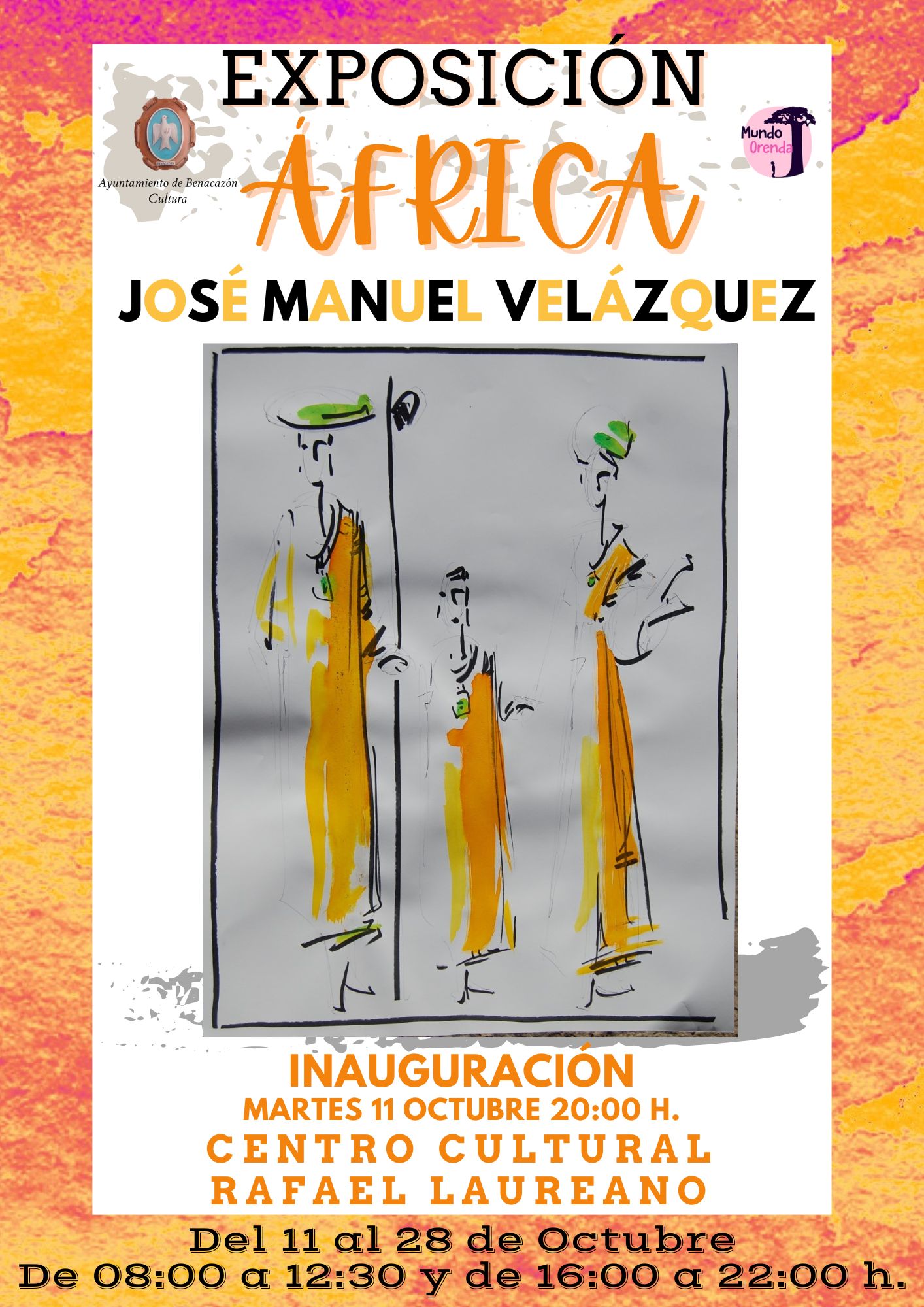El Ayuntamiento de Benacazón informa que el pasado martes 11 de Octubre, fue inaugurada la Exposición "ÁFRICA", por parte del Alcalde Pedro Oropesa y el Equipo de Gobierno. Se compone de una serie de pinturas y dibujos inspirados en el arte africano, obras de nuestro vecino José Manuel Velázquez Guerrero, que ha contado con la colaboración de la Delegación municipal de Cultura y el apoyo de la ONG Mundo Orenda, de la que forma parte.