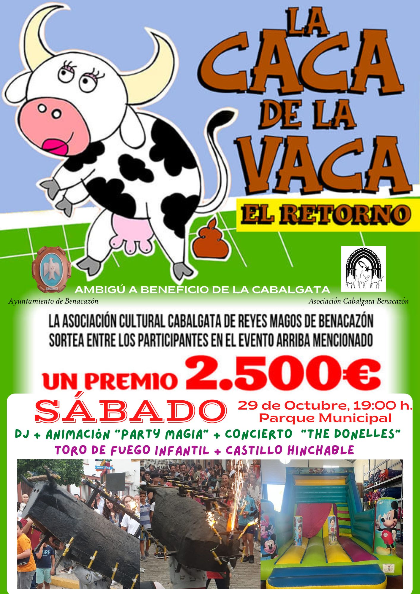 El Ayuntamiento de Benacazón informa sobre la celebración del Festival "LA CACA DE LA VACA", que tendrá lugar el sábado 29 de Octubre a partir de las 19:00 horas en el Parque Municipal de Benacazón, organizado por la Asociación de la Cabalgata de Reyes Magos con la colaboración de la Concejalía municipal de Cultura. Los beneficios, tanto de la venta de papeletas como del ambigú, se destinarán a la Cabalgata 2022.